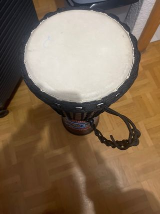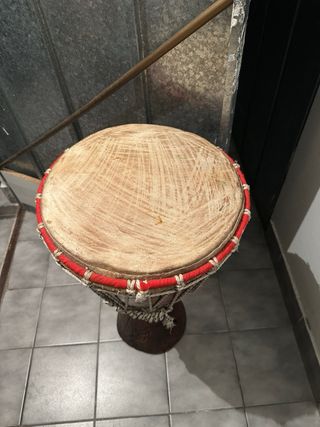 Djembe,tambor con forma de copa originario de África Occidental. Está hecho de un cuerpo de madera tallada y una membrana de piel de cabra que se tensa con cuerdas. Medidas base 30cm,alto 48cm.