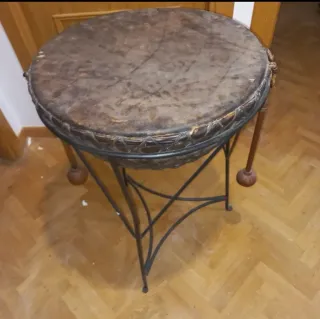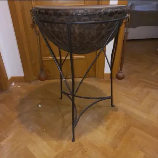 Tambor de estilo tribal con un soporte metálico. - Diseño artesanal. - Soporte de metal negro. Instrumento & Tipo mesa Diámetro 54cm Altura 30cm Soporte metal altura 76cm *Consultar envio
