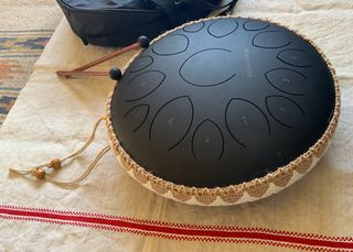 Tambor de lengua de la marca Panda Drum, modelo PRO en Re mayor. Es un instrumento estupendo para empezar a aprender estos tambores melódicos parecidos al handpan. También es recomendable para principiantes en mundo handpan porque puedes practicar el toque y la lógica de la escala. Soy percusionista profesional y recibí este instrumento por grabar un masterclass con el. Luego no lo usé porque me dedico más al handpan. Asi que como nuevo, casi a mitad del precio rebajado de la compañía. Con su funda y mazas con cabeza de goma.