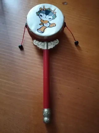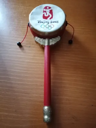 Tambor sonajero conmemorativo de las Olimpiadas de Beijing 2002. - Diseño original. - Incluye el logo de las Olimpiadas y el texto Beijing 2002 . - Mango de color rojo con detalles plateados.