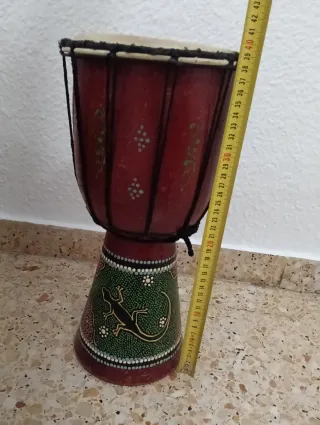 Tambor djembe de madera con un diámetro de parche de 19 cm. - Material: Madera. - Diámetro del parche: 19 cm. Djembe de madera y piel natural. En muy buen estado,suena perfectamente.