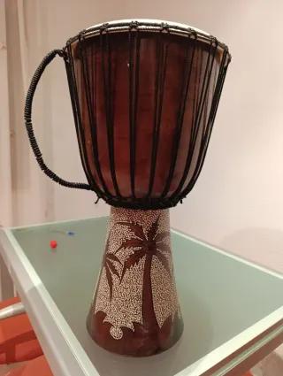 Tambor Yembé auténtico traído de Senegal. Un instrumento musical con un diseño tradicional. Nunca usado pues hay que rasurar la piel. Utilizado solo de adorno Se ha de afeitar la madera. Altura 60. Ancho 30x33 - Cuerpo de madera tallada. - Piel de animal en la parte superior. - Cuerdas para tensar la piel.