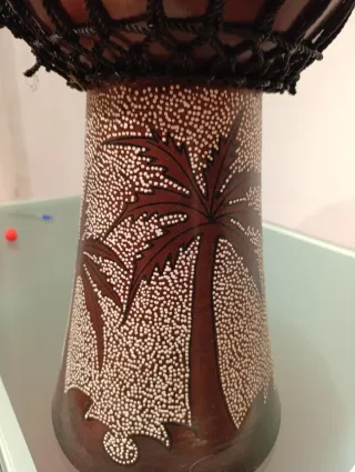 Auténtico tambor Darbuka de Marruecos, con un diseño tradicional y colorido. Lo compré en el zoco de Fez durante un viaje a Marruecos. Medidas: 38cm (alto), 25cm (ancho)