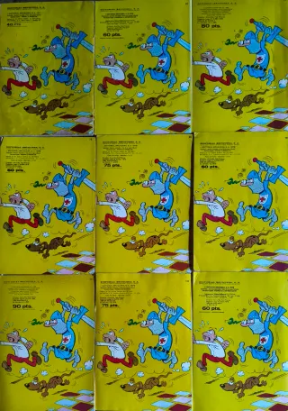 9 comics de Mortadelo y Filemón de la colección Olé de Ediciones B. En buen estado, aunque tienen muchos años y pueden contener desgaste, como rozaduras en el lomo o manchas en alguna página. En ningún caso presentan roturas, pintadas o descolados, se leen perfectamente. Títulos incluidos: La elasticina, a la caza del cuadro, cuarenta y cinco desatinos por minuto, a la caza del Chotta, con el botones Sacarino, con Rompetechos, sin titulo en portada. Más packs de Mortadelo y Filemon en mi perfil.
