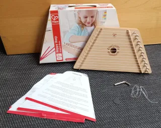 Arpa de juguete de madera de la marca Hape, modelo Happy Harp Está en perfectas condiciones generales, como nuevo, tan solo una leve marca detrás sin importancia La caja está un poco deteriorada, tiene una rotura interior en el cartón, nada grave Un instrumento musical para los más pequeños Fabricada en madera Diseño atractivo Mide unos 36 cm de ancho y 20 cm de alto Viene con una pua, uns cuerda de recambio y la herramienta original para tensar las cuerdas También tiene instrucciones en papel