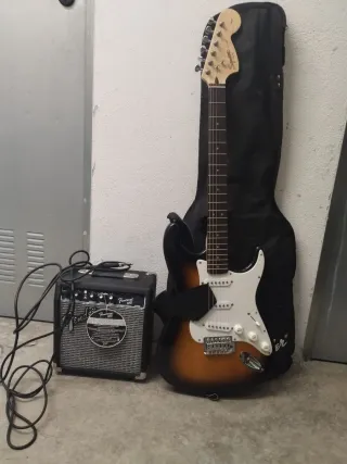 Pack de guitarra eléctrica Fender Squier con acabado sunburst y amplificador. - Guitarra eléctrica tipo Stratocaster. - Amplificador Fender Frontman 10G. - Incluye funda para guitarra. - Cable de conexión.