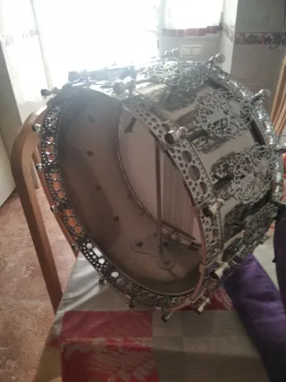 Tambor de diseño único, elaborado por un maestro artesano. - Cuerpo del tambor con detalles ornamentales. - Aro metálico con grabados. - Sistema de tensión con varillas.