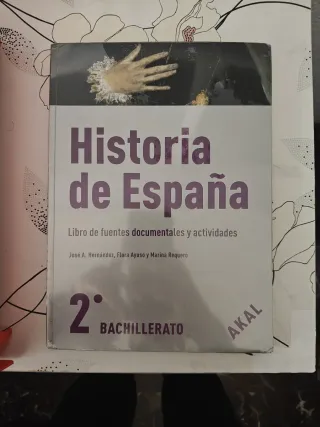 Libro de Texto: Historia de España 2º Bachillerato (Akal) Características Principales: Título: Historia de España: Libro de fuentes documentales y actividades. Nivel: 2º de Bachillerato. Autores: José A. Hernández Úbeda, Flora Ayuso Ferrera y Marina Requero Martín. Editorial: Ediciones Akal, S.A.. ISBN: 978-8446030768. Contenido: El libro ofrece una visión completa de la Historia de España desde la Prehistoria hasta la Edad Contemporánea, siguiendo los contenidos ministeriales. Incluye texto principal y un "libro de fuentes documentales y actividades" con documentos escritos (historiográficos, biográficos, literarios)