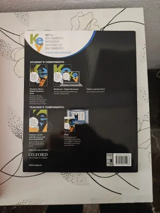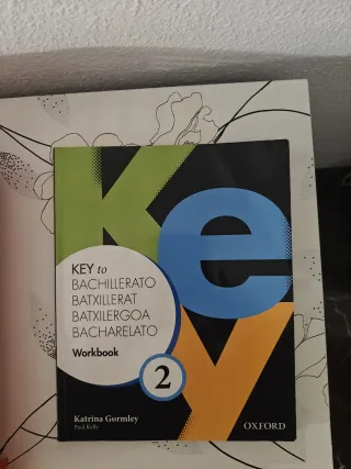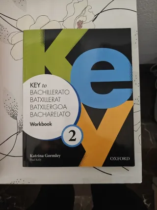 Libro de Texto de Inglés: Key to Bachillerato 2. Workbook Características Principales: Título: Key to Bachillerato 2. Workbook (Spa) Nivel: 2º de Bachillerato (inglés como lengua extranjera). Autores: Katrina Gormley y Richard Storton. Editorial: Oxford University Press España, S.A.. ISBN: 978-0194611268. Contenido: Este es el libro de ejercicios (workbook) que complementa al "Student's Book". Proporciona práctica adicional y refuerzo de los conceptos presentados en el libro principal, con una variedad de actividades diseñadas para desarrollar las habilidades de comunicación y consolidar el nivel de inglés (equivalente a un B1).