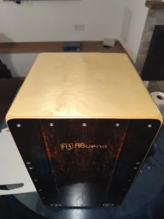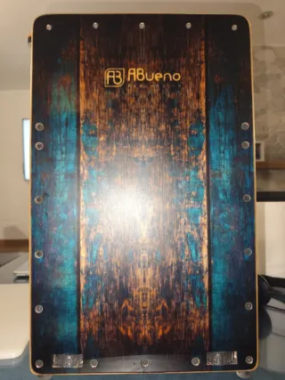 Cajón flamenco de la marca Antonio Bueno con un diseño rústico y llamativo. - Diseño con acabado en madera y detalles en azul y naranja. - Logo de Antonio Bueno en la parte superior. Es un cajón profesional y es súper polivalente con una calidad y finura excelente. Nunca se ha usado, está totalmente nuevo sin usar. SIN ESTRENAR. Oportunidad increíble.