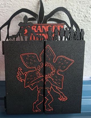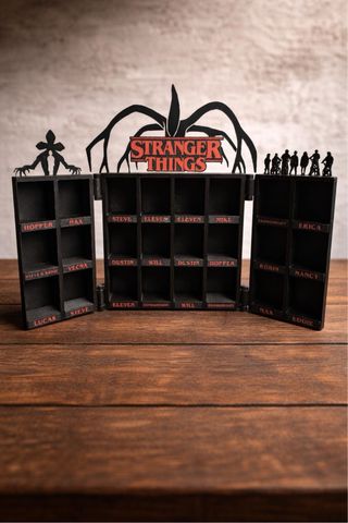 Expositor temático de Stranger Things con diseño de bisagras. Ideal para coleccionistas. - Diseño inspirado en la serie. - Compartimentos para figuras o pequeños objetos. - Decoración con siluetas de personajes y el logo de la serie.