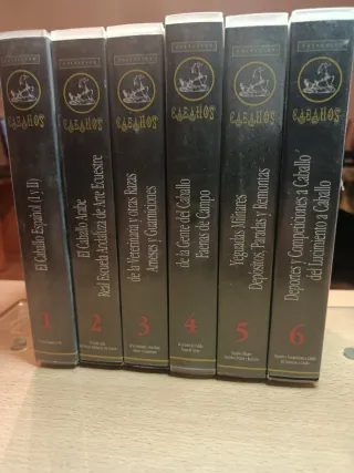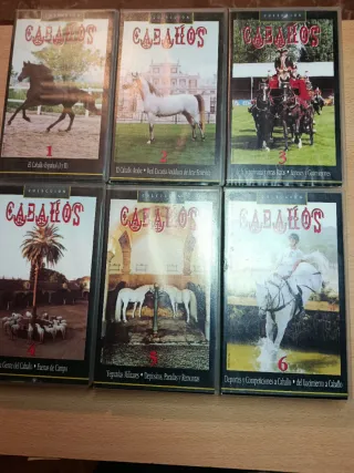 Conjunto de seis cintas VHS sobre el mundo del caballo. Cada volumen aborda un tema específico. - Volumen 1: El Caballo Español (I y II) - Volumen 2: El Caballo Árabe - Real Escuela Andaluza de Arte Ecuestre - Volumen 3: De la Veterinaria y otras Razas - Arneses y Guarniciones - Volumen 4: De la Gente del Caballo - Faenas de Campo - Volumen 5: Yeguadas Militares - Depósitos, Paradas y Remontas - Volumen 6: Deportes y Competiciones a Caballo - Del Lucimiento a Caballo