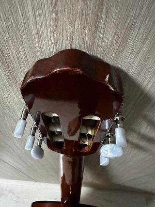 Guitarra española clásica con acabado en madera oscura. - funda. -cejilla. -Afinador tipo clip. - Clavijero plateado. - Diseño tradicional. Le falta una cuerda ,tiene un pequeño golpe en la parte de arriba y la funda tiene la cuerda rota.