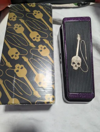 Pedal wah Dunlop Kirk Hammett en color morado. Se incluye la caja original. - Diseño con calavera y guitarra. - Acabado sparkle.