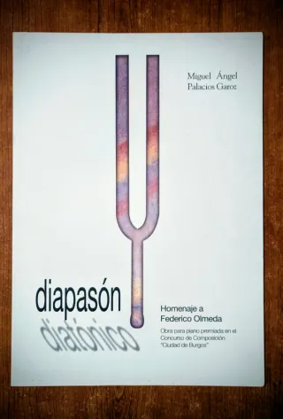 Diapasón diatónico. Homenaje a Federico Olmeda. Miguel Angel Palacios. Obra para piano premiada en el concurso de composición "Ciudad de Burgos" Ayuntamiento de Burgos. 39 paginas. Tapa blanda con solapas. Medidas: 30 x 21 cm.