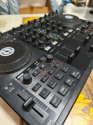 Controlador de DJ Traktor S4 MK1 en buen estado a pesar de sus marcas de uso en los botones del play. Ideal para mezclar música. Los botones funcionan perfectamente. - Jog wheels sensibles al tacto. - Sección de efectos integrada. - Controles de transporte y navegación. - Faders de tempo y crossfader. - Entrega preferiblemente en mano.