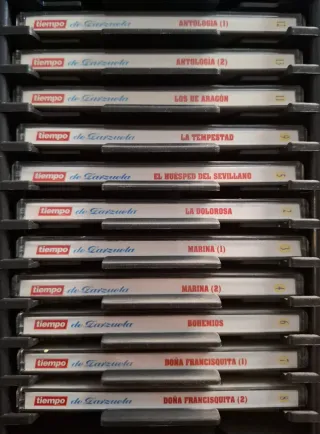 Conjunto de 11 CD's de zarzuelas famosas de la colección "Tiempo de Zarzuela". Se incluye el archivador de extracción automática que aparece en las fotos. Los títulos son: - Antología (1) - Antología (2) - Los de Aragón - La Tempestad - El Huésped del Sevillano - La Dolorosa - Marina (1) - Marina (2) - Bohemios - Doña Francisquita (1) - Doña Francisquita (2)