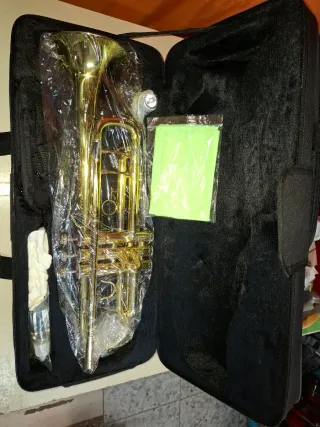 Trompeta nueva a estrenar. Con tres pistones de acero inoxidable. De latón dorado. Incluye boquilla, funda, paño de limpieza y aceite para engrasar.