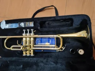 Trompeta en acabado dorado, lista para ser tocada. Incluye su estuche original y varios utensilios. - Trompeta de latón. - Acabado brillante. - Incluye estuche. - Incluye accesorios.