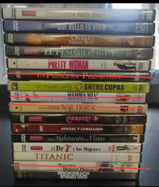 Paseando a Miss Daisy 2€ Que bello es vivir 2€ Otoño en nueva york 3€ El peso del agua 3€ Pretty woman 3€ Pack Un buen año y Entre copas 5€ Cabaret 4€ Oficial y caballero 3€ Una habitación con vistas 3€ El dr. t y las mujeres 2€ Titanic 3€ Brokeback mountain 3€ Blown away (volar por los aires) 5€ Cuando callan las trompetas 3€ El patriota 2,50€ El ultimo marshal 2€ Evasion sin limite 2€ El hundimiento 2,50€ El niño con el pijama de rayas 3€ Savior 2,50€ La delgada linea roja 2,50€ Pearl harbor 5€ Trece días 2€ Se puede pedir más fotos sin compromiso