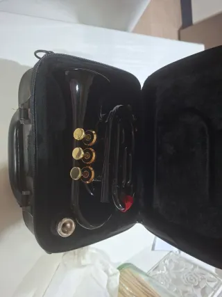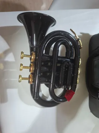 Trompeta tipo pocket en color negro. Un instrumento compacto y llamativo.Tiene un pequeño golpe que no impide su funcionamiento. Se ve en la última foto - Acabado brillante. - Válvulas doradas. - Incluye funda.