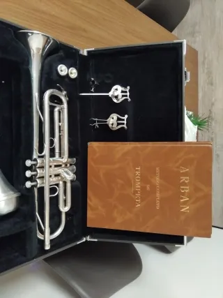 Trompeta Yamaha YTR4335 en excelente estado de conservación. Tiene un pequeño bollo en la campana y en una de las bombs, se aprecia en la foto( no afecta al sonido) Siempre la he tenido en casa. Su sonido es excelente y la laca está en perfecto estado. - Incluye maletin original Yamaha con mochila. - Boquilla Yamaha - Sordina" wah wah "de la marca Dennis wick valorada en 50€ - Atril plegable - Métodos Arban, Clarke y Irons. - Soporte vertical sólido ( Primera foto) -Aceite "fast" para pistones y grasa para bombas y demás piezas. - kit de limpieza ( cepillos) etc "Pack muy completo" Si quieres solo la trompeta podemos hablarlo