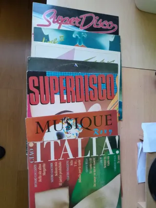 Colección de discos de vinilo con música pop y dance. - Super Disco (varias ediciones) - Musique con Roxy - Italia! con temas como Ciao, Bella sin alma, Señora mía, El jardín prohibido, Sólo, Y tú..., Sábado por la tarde, Yo canto y tú, De amor ya no se muere, Sereno es, Vado via, Te amo. - Artistas como Richard Cocciante, Sandro Giacobbe, Claudio Baglioni, Gianni Bella, Drupi, Umberto Tozzi.