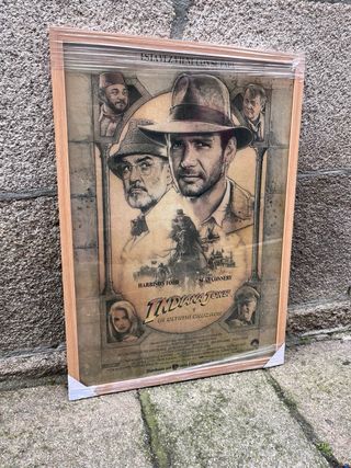 Póster de la película Indiana Jones y la Última Cruzada. Enmarcado en marco de madera con cristal. - Incluye a Harrison Ford y Sean Connery. - Diseño con los personajes principales.