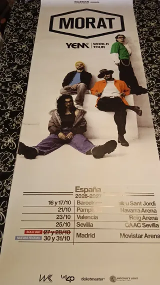 Cartel exclusivo de la gira de Morat por España, anunciado en los kioscos de Madrid. Las medidas, unidades y precios de los que dispongo son: - 65 centímetros de ancho y 185 de alto → 2 unidades (20 euros cada uno) - 65 centímetros de ancho y 148 de alto → 1 unidad (18 euros) No activo el envío para no dañar el cartel durante el transporte. Preguntar su disponibilidad. Gracias.