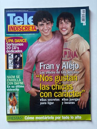 Revista Tele Indiscreta (Del lunes 2 al domingo 8 de Junio) Alejo Sauras y Fran Perea en portada. Incluye reportajes de: Alejo Sauras y Fran Perea, Naim Thomas OT, Upa Dance, Gareth Gates, Festival Eurovision 2003, Beth, David Bisbal, Xavier Montjonell, Jorge Javier Vazquez, Carmen Alcayde, Courtney Cox, Anne Igartiburu, Ana Obregon, Juanjo De la iglesia...