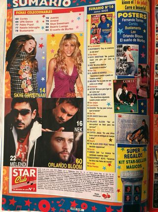 Revista starclub 16. Contenido de: Shakira Skye Sweetnam Melendi Nek David Bustamante Juanes Amaral Natalie Imbruglia Beatriz Luengo El Sueño de Morfeo Grupos musicales internacionales The Black Eyed Peas Green Day Backstreet Boys Actores y televisión Orlando Bloom UPA Dance Pablo Puyol Celebridades / famosos Jesús Cortés Mary-Kate Olsen Ashley Olsen. NO INCLUYE POSTERS.