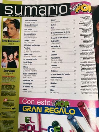 Revistas Super Pop completas y en perfecto estado. Como nuevas. Números: 655, 656, 663, 665 (Año 2003) Incluye posters: Serie Embrujadas,Fran Perea Los Serrano, David Beckham, Yotuel Romero, Bisbal, Upa dance, Josh Hartnett y coleccionables un paso adelante y operacion triunfo. Reportajes de: Fran Perea, Embrujadas, Eminem, Beckham, El canto del loco, Piratas del caribe, Andy y lucas, La Oreja de van gogh, Chenoa, Bustamante, Avril Lavigne, Shakira, Beth, Hugo Salazar, Manuel Carrasco, T.a.t.u, Los serrano, Lunae, Los Angeles de charlie, Javi Cantero, Ricky Martin, Linkin Park, Alex Ubago, Naim Thomas, OT 1....