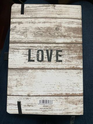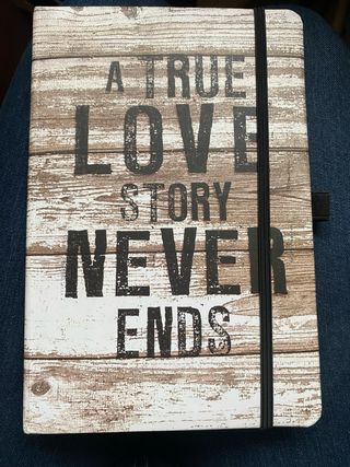 Libreta con un diseño rústico de madera y la frase A True Love Story Never Ends. Ideal para tus notas. - Diseño de madera envejecida. - Frase inspiradora en la portada. - Cierre con goma elástica negra.
