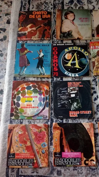Lote de doce vinilos de música variada, incluyendo géneros festivos, flamenco, sevillanas y pop rock nacional e internacional. -A 1 euro (pedido mínimo 3 singles). -Algunas carpetas en mal estado,los vinilos muy bien. - Chato de la Isla - Gitanillo de Oro - Jose Menese - Jotas de Baile - Cosmos 70 - Les Charlots font l'Espagne - Pepe Pinto - Rafael Farina - Arlequin Opus 5 - Broad Street Gang - Los Bravos - Fandangos