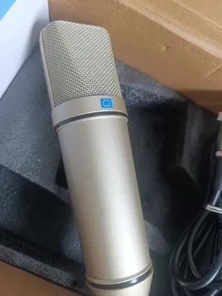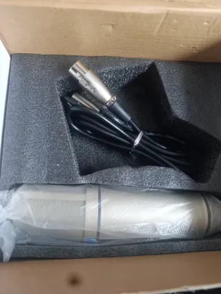 Micrófono condensador con un acabado plateado elegante. Diseñado para capturar audio con claridad. Incluye su cable con puntas metálicas y araña para trípode (la araña es de plástico) En su caja original Studio microphone condenser - Cuerpo metálico y pesado - Rejilla protectora. - Incluye cable de conexión.