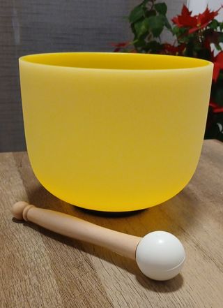 Cuenco de cuarzo de 20cm de diámetro. Incluye mazo y anillo. - Color amarillo. - Material de cuarzo. - Diámetro de 20cm. - Nota RE.