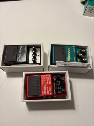 Pack de tres pedales de efectos para guitarra de la marca Boss. Actualmente no funcionan por haberlos utilizado en corriente AC en vez de DC. Quizas tengan arreglo. Quien sepa que puede arreglar-los se los dejo por este precio. - Pedal Boss ML-2 Metal Core. - Pedal Boss TR-2 Tremolo. - Pedal Boss RC-3 Loop Station.