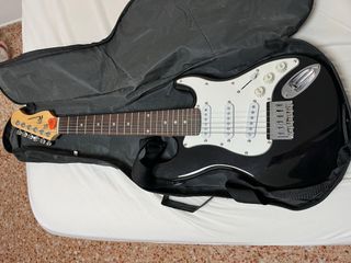 Guitarra eléctrica junior de la marca Rochester en color negro. Ideal para iniciarse en la música. - Cuerpo de guitarra eléctrica. - Color negro brillante. - Incluye funda de transporte. - Incluye altavoz pequeño - sin uso