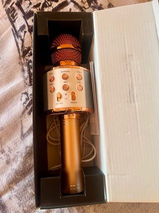 Micrófono portátil para karaoke con acabado rosa metálico. - Diseño Hand Held KTV. - Conexión inalámbrica. - Luces LED integradas.