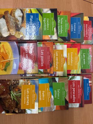 colección de 15 libros de cocina de cocinar con Inés y Simone Ortega.  marinada si mermeladas, crema y caldos, tartas, saladas, suflé y tortillas, cocidos y legumbres, salsas y aliño, platos fríos, pattes y Terrinas, las carnes, las verduras, guisos y sopas, las pastas, las verduras asadas y a la parrilla, ensaladas y carpaccios, las aves,  los arroces y los pescados. Dos libros tienen un pequeño golpe en el lomo de la encuadernación