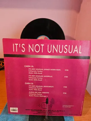 Parker – It’s Not Unusual Vinilo VG+ con ligerísimas señales normales de uso, sin nada que afecte al sonido. Reproducción sólida y agradable. Funda VG+, en buen estado general, con desgaste leve propio del paso del tiempo. Copia cuidada, ya poco habitual de ver en este estado. Limpio con máquina de ultrasonidos y listo para pinchar. Incluye: A1 It’s Not Unusual (Dance Down Beat) A2 It’s Not Unusual (Acapella) B1 It’s Not Unusual (Rockabilly) B2 Alone (No Vox Version) Género: Euro House / Downtempo Año: 1994 Palabras clave: euro house, house 90s, downtempo, vocal house, italo house, classics, dj, club, Omen, España