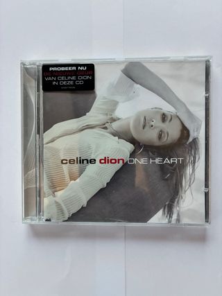 CD de música de Celine Dion. - Título del álbum: One Heart. - Incluye un adhesivo promocional en neerlandés que dice Prueba ahora la nueva fragancia de Celine Dion en este CD.