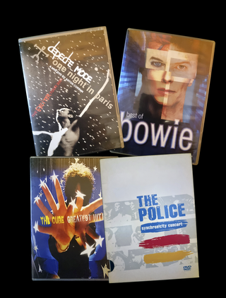 Pack de 4 DVDs con directos y recopilatorios esenciales de iconos de los 80s y New Wave. - Depeche Mode: One Night in Paris - David Bowie: Best of Bowie - The Cure: Greatest Hits - The Police: Synchronicity Concert - Precio total del pack: 45€