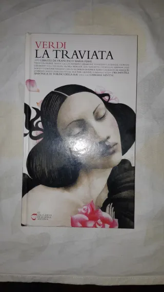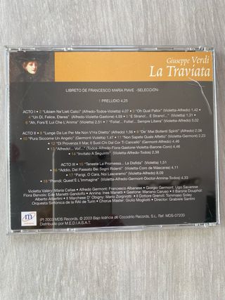 Libreto de la ópera La Traviata de Giuseppe Verdi. - Libreto de Francesco Maria Piave. - Incluye elenco: Violetta Valery (Maria Callas), Alfredo Germont (Francesco Albanese), Giorgio Germont (Ugo Savarese), Flora Bervoix (Ede Marietti), Annina (Gandolfo), Ines Maretti. - Personajes secundarios: Gastone (Mariano Caruso), El Barón Douphol (Alberto Albertini), El Marqués d'Obigny (Mario Zoroniotti), El Doctor Grenvil (Tommaso Soley). - Orquesta Sinfónica de Torino della RAI. - Director: Gabriele Santini. - Edición Los Clásicos de la Ópera 400 Años de El País.