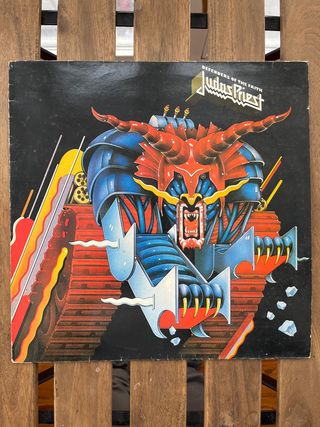 Disco de vinilo del álbum Defenders of the Faith de Judas Priest. - Género: Heavy Metal. - Portada icónica con el diseño del robot-tanque.