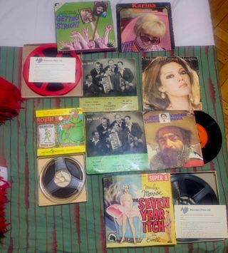 Colección variada de películas y discos. Incluye cintas de Robin Hood, Marilyn Monroe (Seven Year Itch), y más. También hay discos de Karina, Elsa Baeza y Los Xey. Algunos artículos muestran señales de uso, pero en general están en buen estado. - Variedad de géneros: infantil, latino, romántico y recopilaciones. - Formato: Cintas de 8mm y discos de vinilo. - Vinilo de Karina tiene firmado de ello.