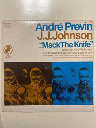 Disco de vinilo de jazz con André Previn y J.J. Johnson. US 1968 - Mack The Knife y otras canciones de Kurt Weill. - Incluye Red Mitchell (Bajo), Frank Capp (Batería). - Títulos: Mack The Knife, Bilbao-Song, Barbara-Song, Overture, Seeräuber Jenny, Surabaya-Johnny, Wie Man Sich Bettet, Unzulänglichkeit. - Columbia Jazz Odyssey, estéreo.