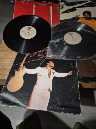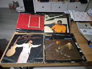 Lote de vinilos de George Benson. Pertenecen a colección privada pero con problemas de humedades tienen las caratulas en muy malas condiciones. Los vinilos estaban todos protegidos en perfecto estado excepto el disco 2 de weekend in LA, aun así con limpieza de polvo se oírla bien, no tienen rayas. - Body Talk - In Flight - George Benson, weekend in LA - Bad Benson