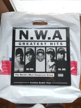 Vinilo de N.W.A. Greatest Hits. Contiene The World's Most Dangerous Group. LP - Contiene doble vinilo. - Incluye Parental Advisory. El disco NWA greatest hits traído de Los Ángeles California. El disco se encuentra precintado sin abrir original ICE T public enemy run DMC cypress Hill epmd rap hiphop graffiti París Dr Dre Snoop Dogg Notorious BIG Tupac Gangstar ll