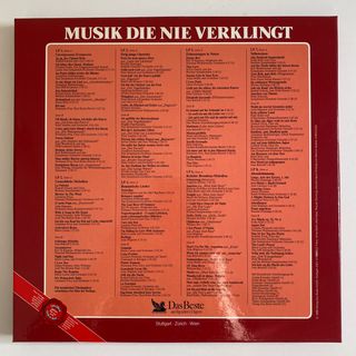 Cofre de 8 LP vinilos "La música que no desaparecerá - Musik die nie verklingt”, con Jessye Norman, Plácido Domingo, Mario Lanza, Kiri Te Kanawa, Luciano Pavarotti, Josep Carreras, etc. 1988, Verlag Das Beste GmbH, Stuttgart (GEV 21780062). Ver contenido en la foto del dorso del cofre.